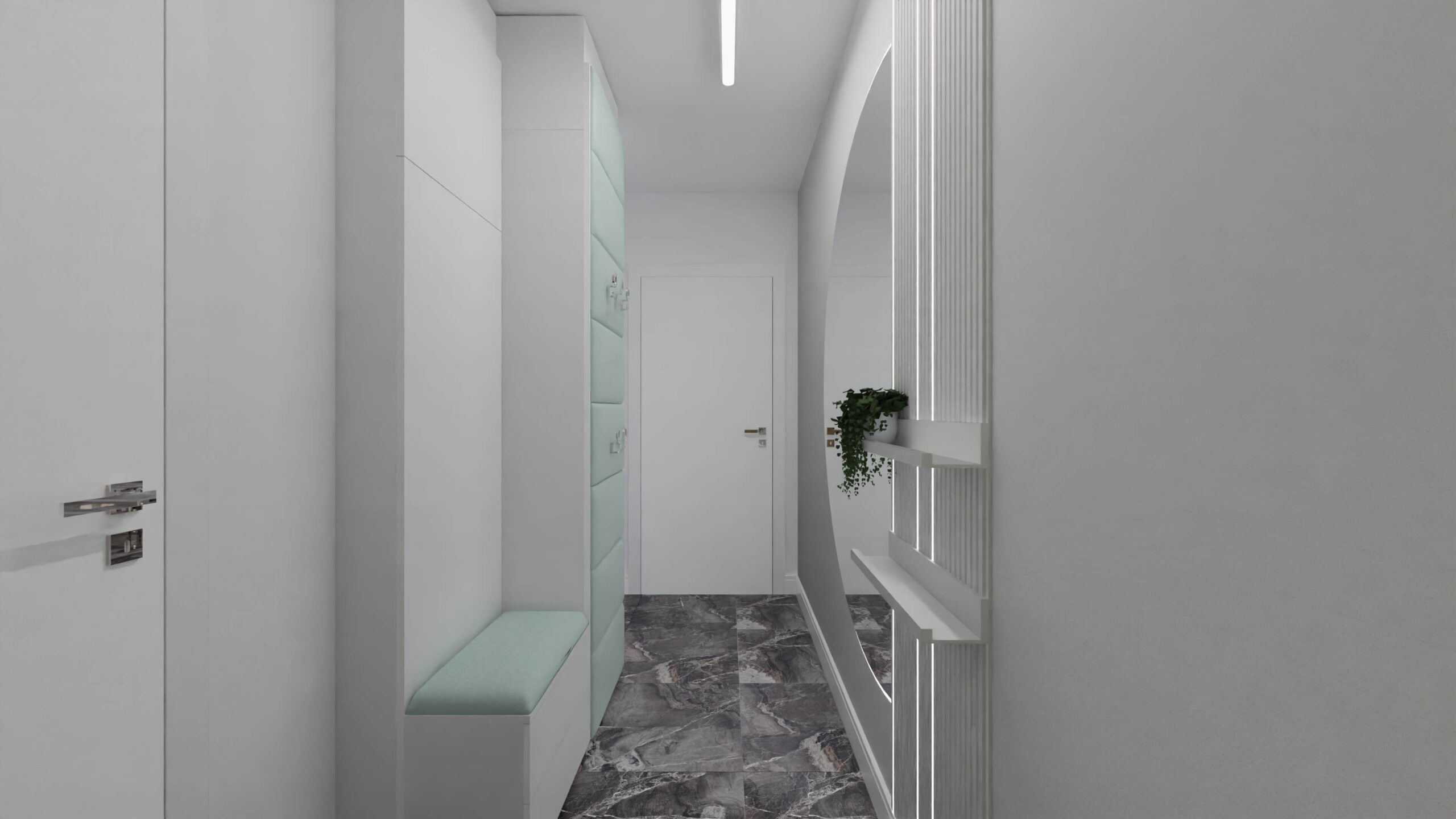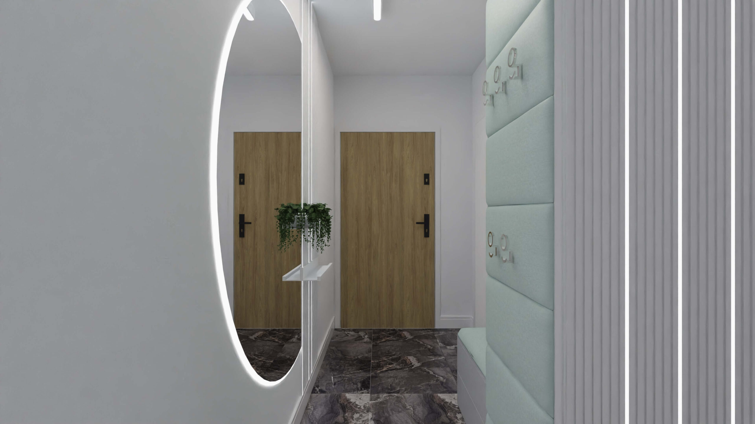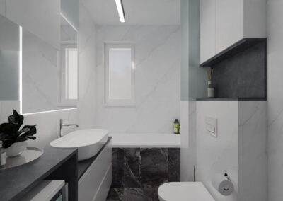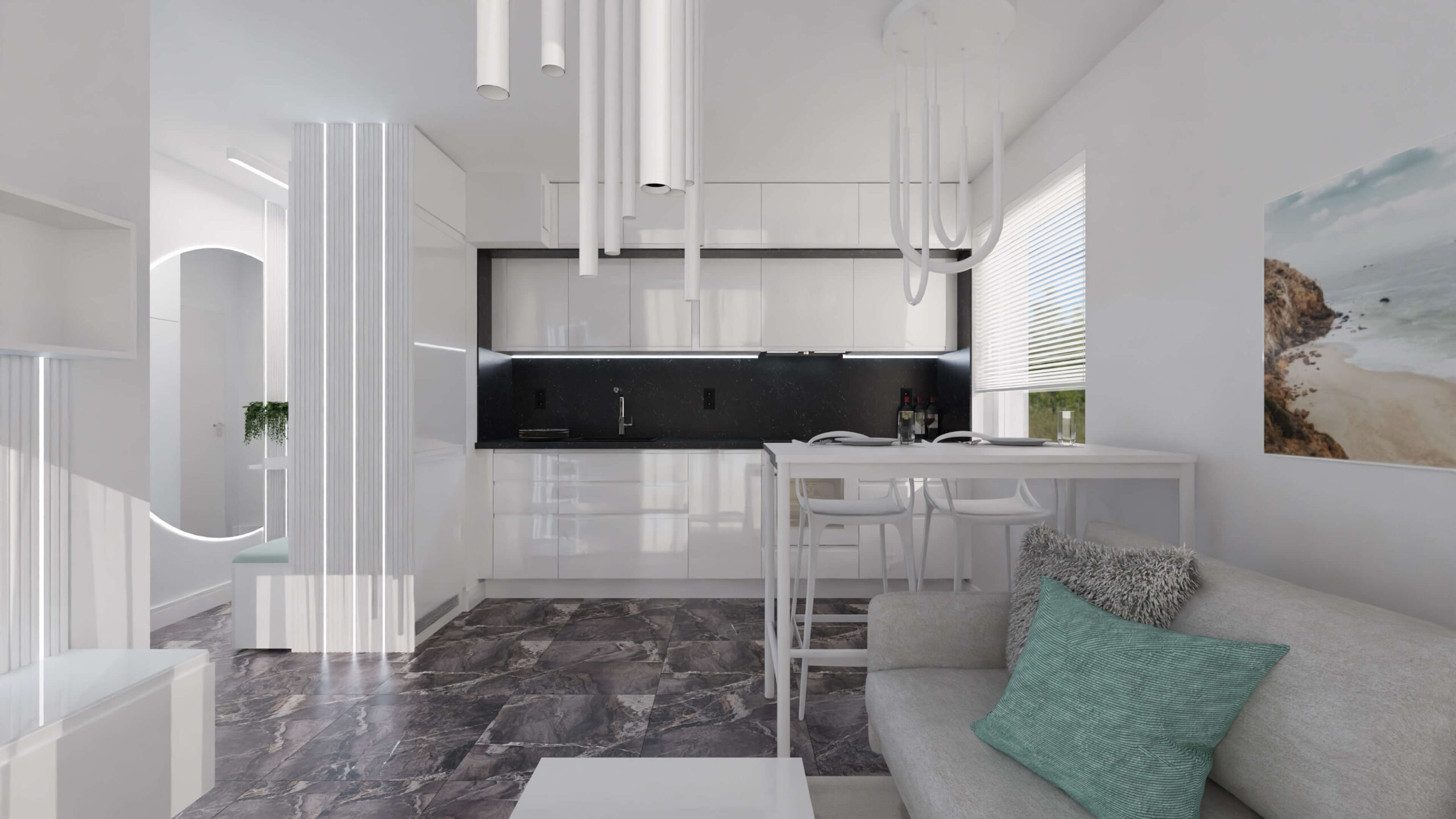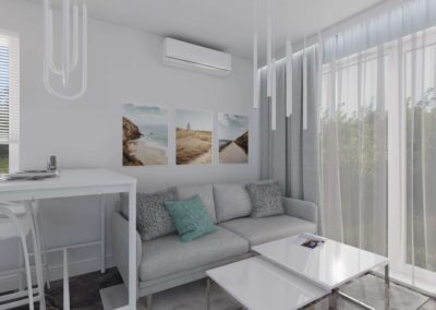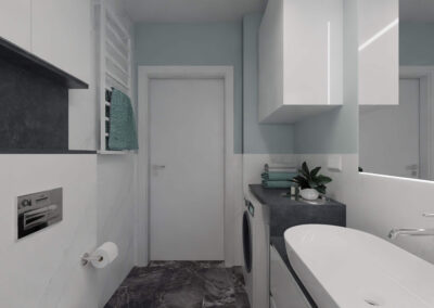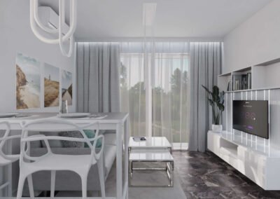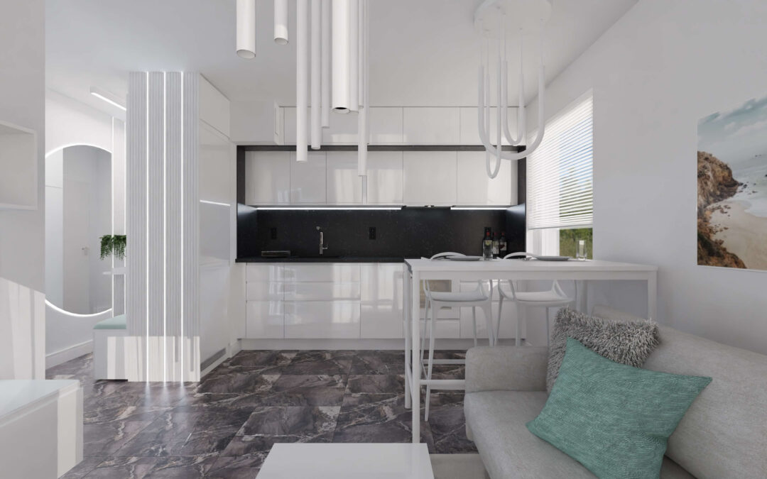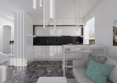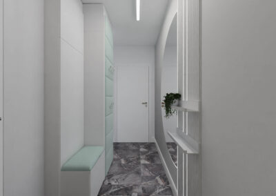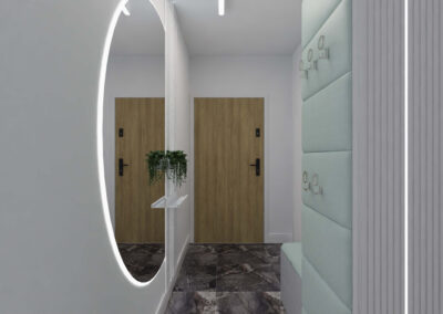 Mieszkanie w stylu nowoczesnym Mieszkanie w stylu nowoczesnym i stonowanych barwach przełamanych miętą. Projekt obejmował całe wnętrze: salon z aneksem kuchennym, sypialnię, łazienkę i przedpokój.