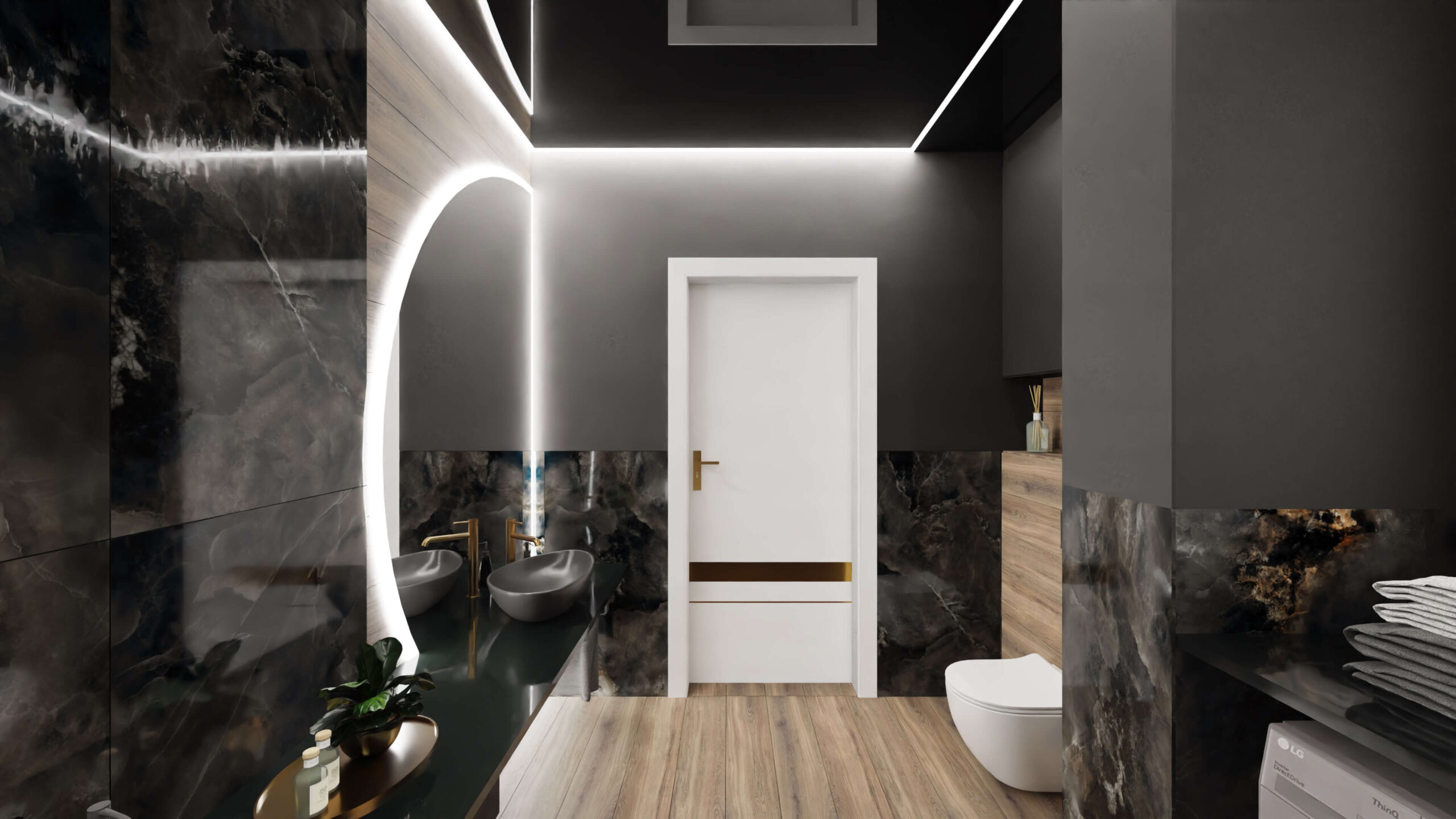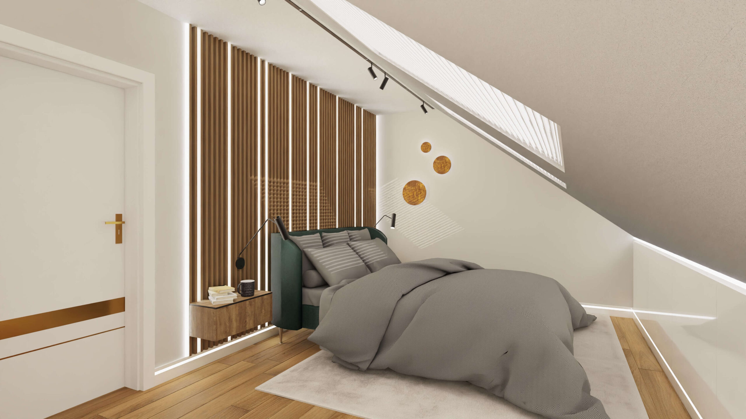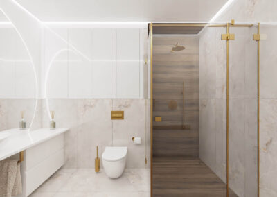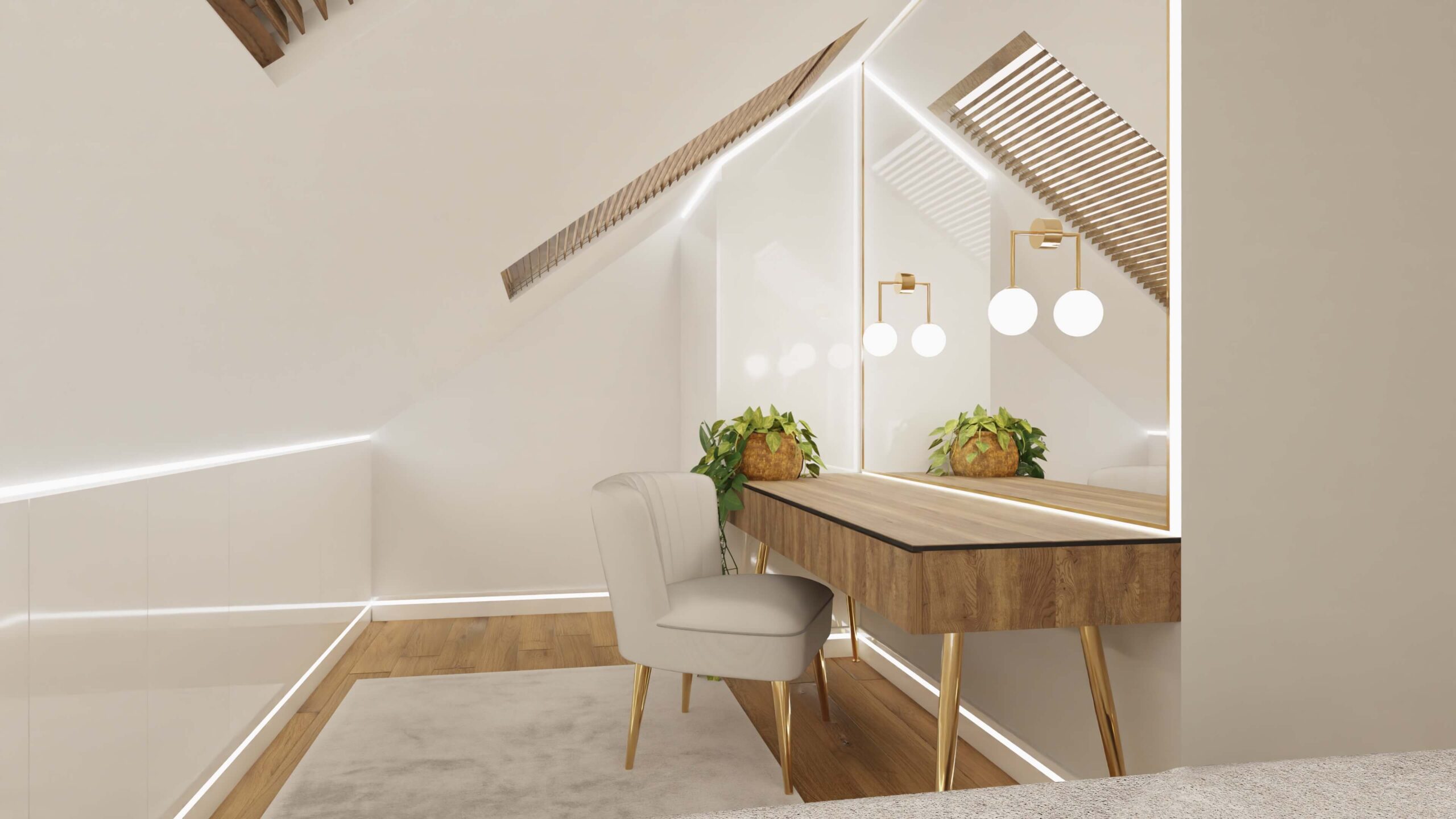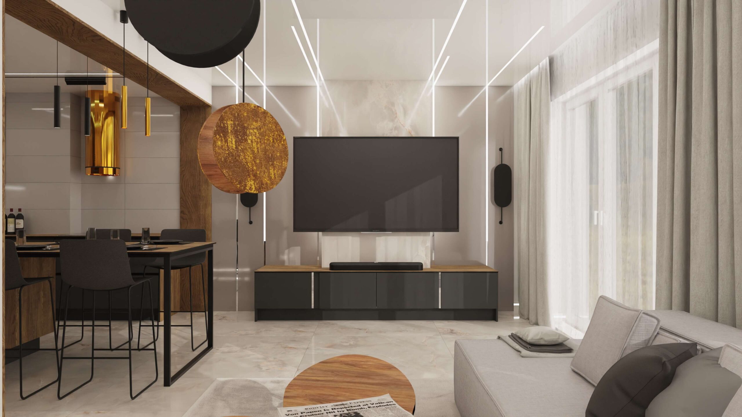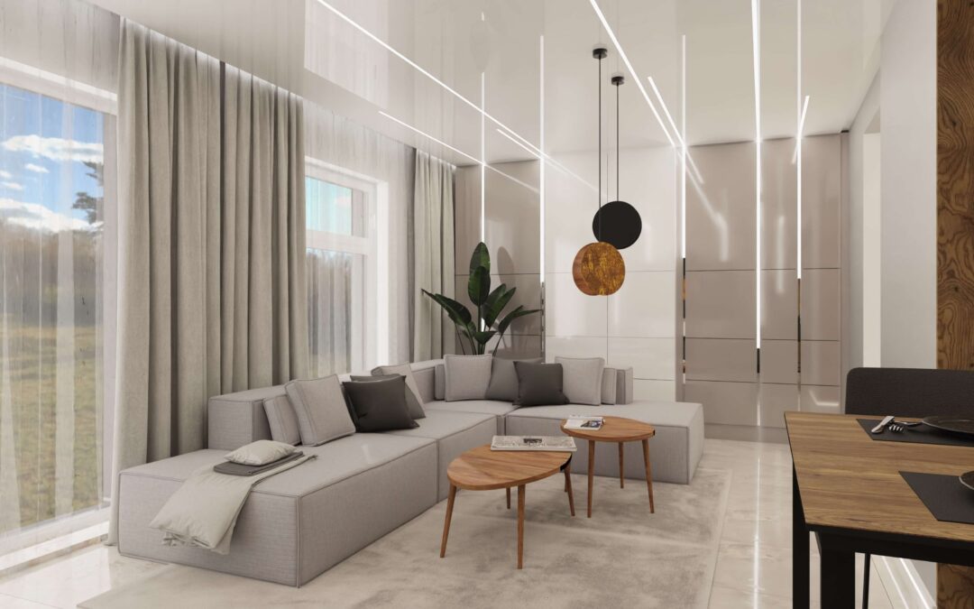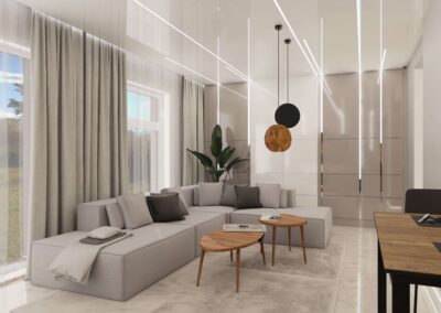 Projekt nowoczesnego domu utrzymanego w barwach neutralnych z elementami industrialnymi i złotymi akcentami.
