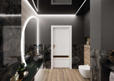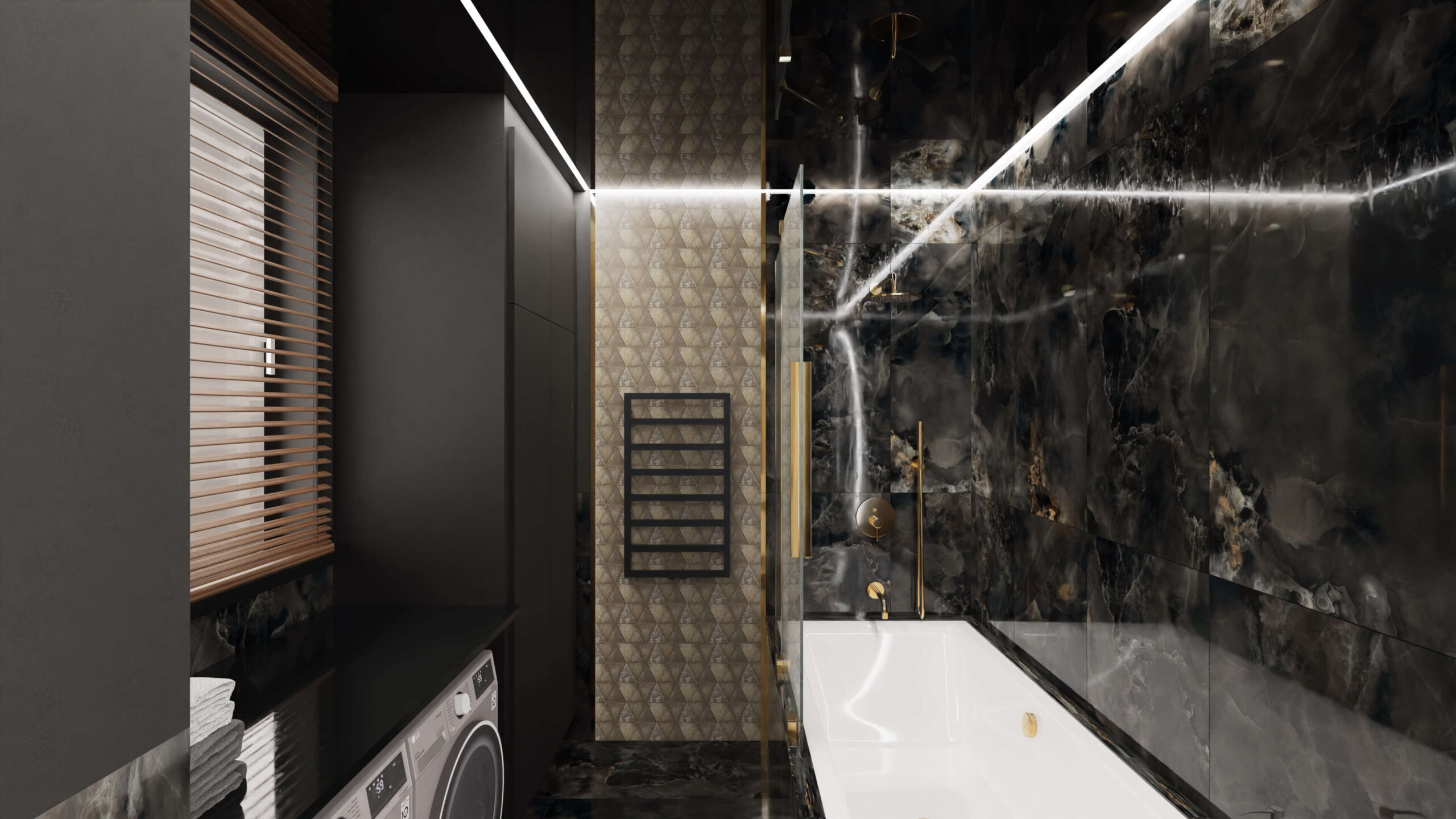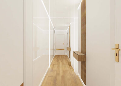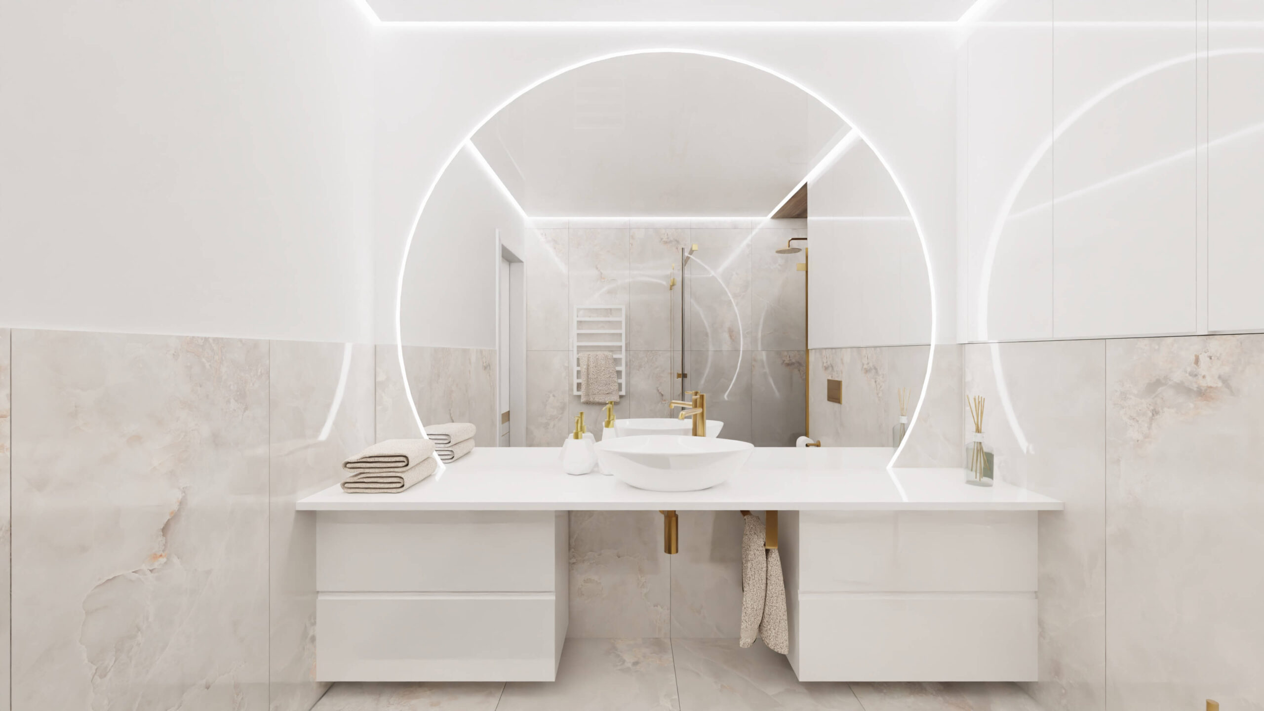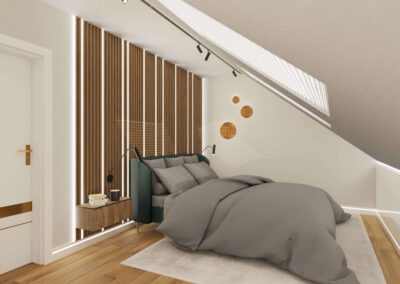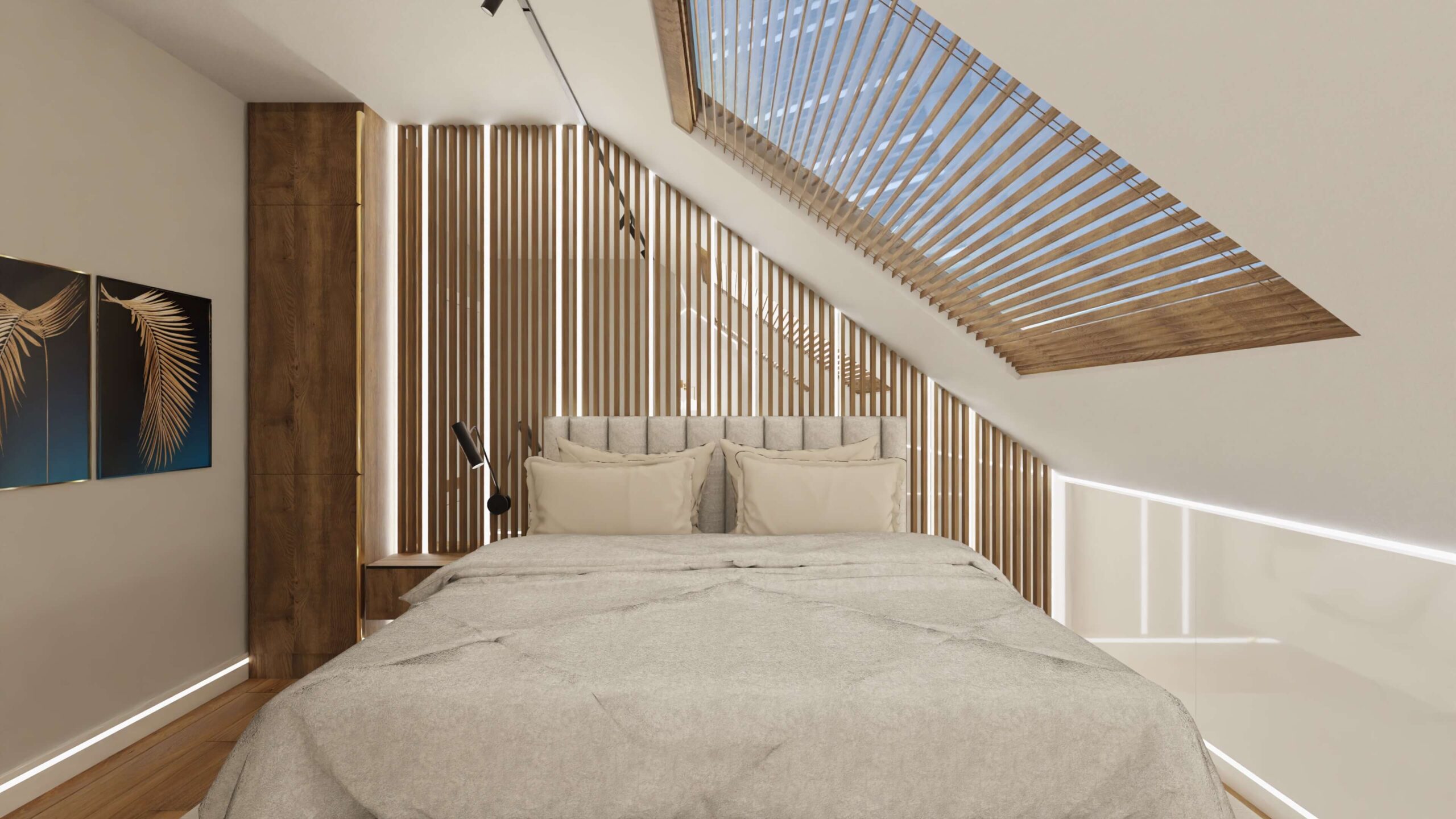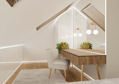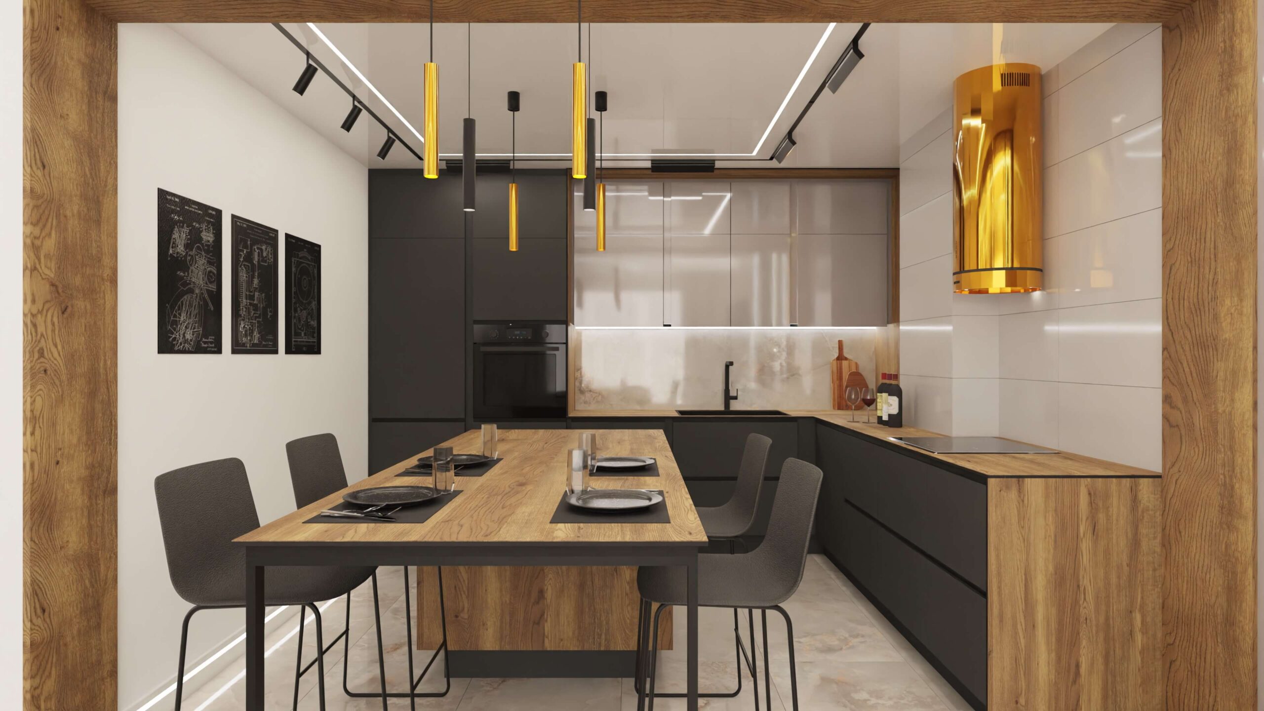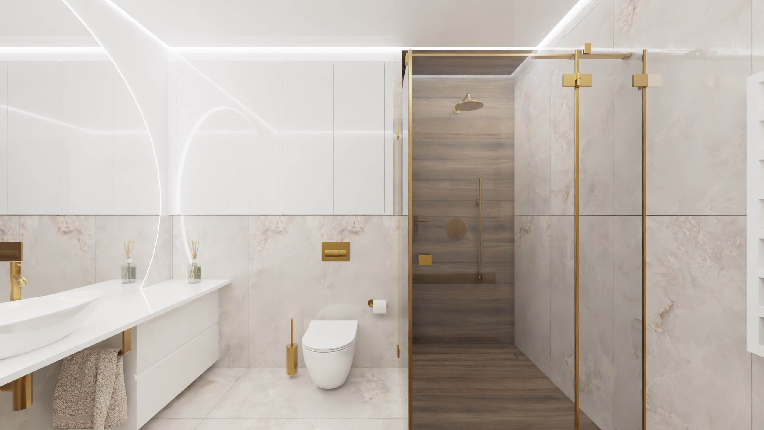 Projekt nowoczesnego domu utrzymanego w barwach neutralnych z elementami industrialnymi i złotymi akcentami.